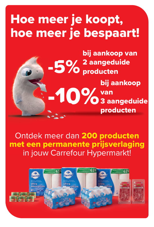 Wie één stuk koopt, betaalt de gewone prijs. Vanaf twee stuks geldt automatisch 5% korting en vanaf drie stuks loopt de korting op tot 10%. Onder deze producten vinden klanten: Materne abrikozencompote (375g), Carrefour tagliatelle (500g), Carrefour Dessert koffiecapsules (20 stuks) of Coca-Cola Light in blik (6x33cl).