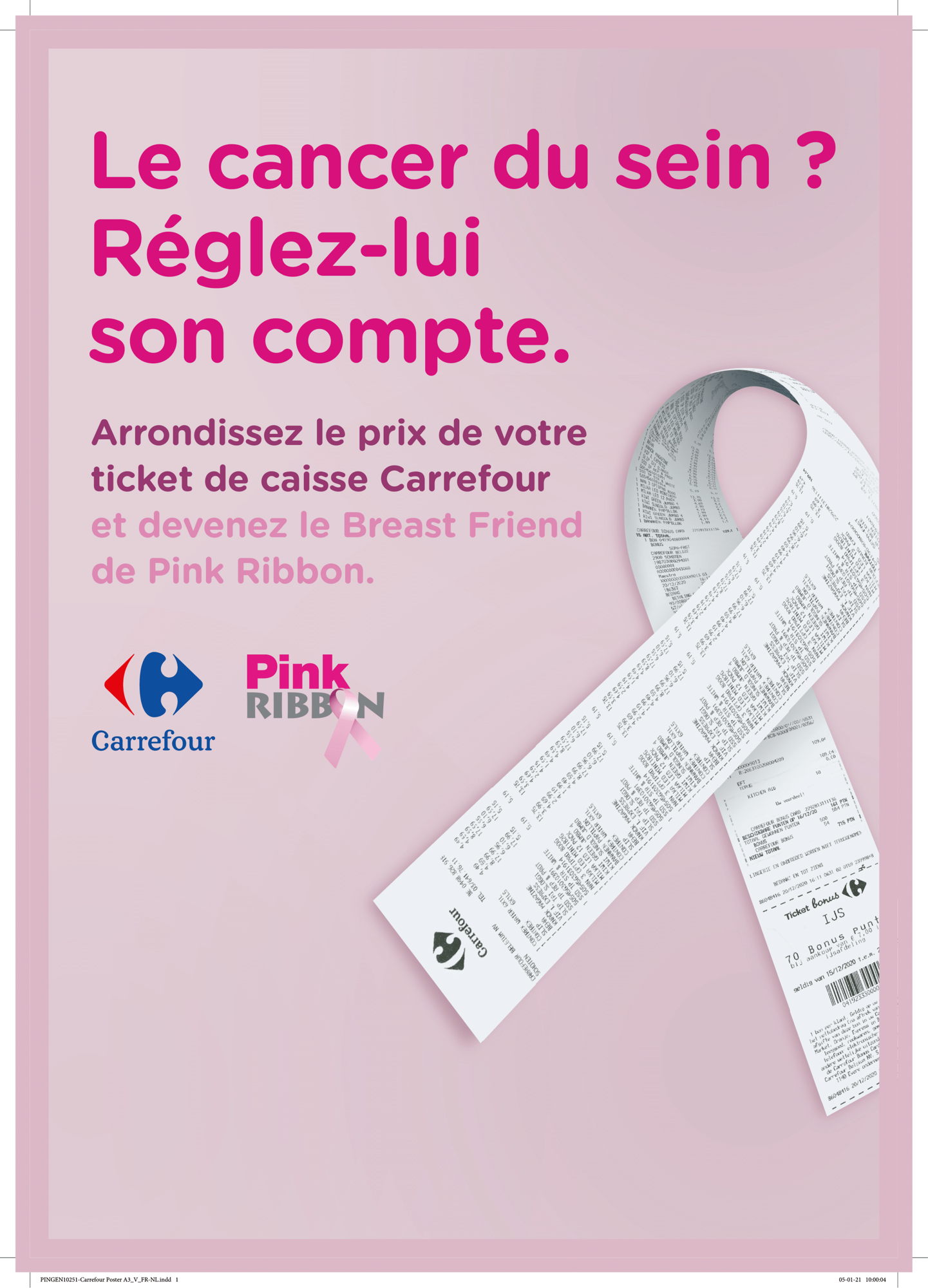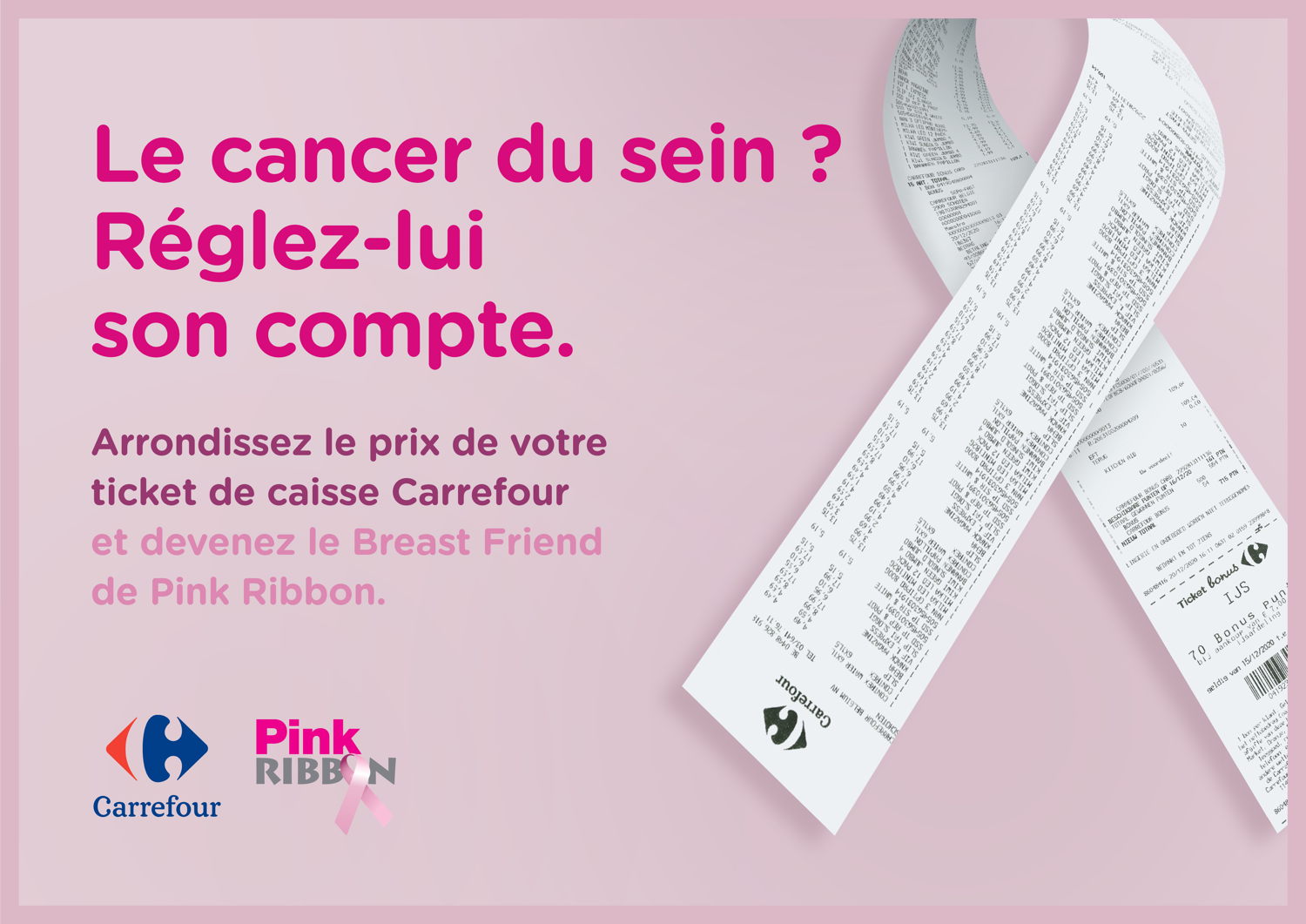 Une femme sur neuf développe un cancer du sein au cours de sa vie. Pink Ribbon lutte depuis des années contre la maladie en encourageant la prévention et le dépistage précoce, et en mettant l’accent sur la prise en charge psychosociale dans le but d’améliorer la qualité de vie des patientes et de leur entourage. Carrefour, qui est partenaire structurel de Pink Ribbon depuis six ans, soutient l’association aux travers d’actions menées chaque année dans ses magasins.