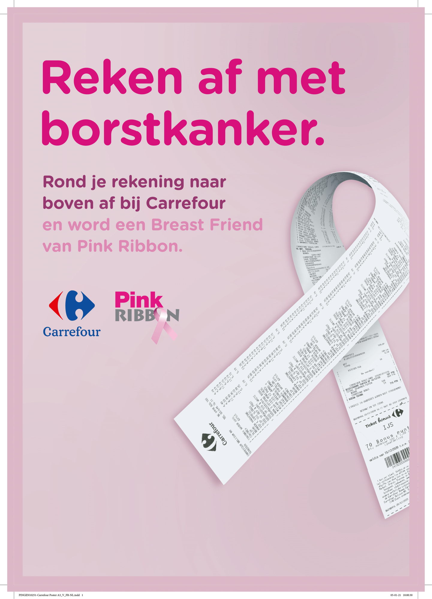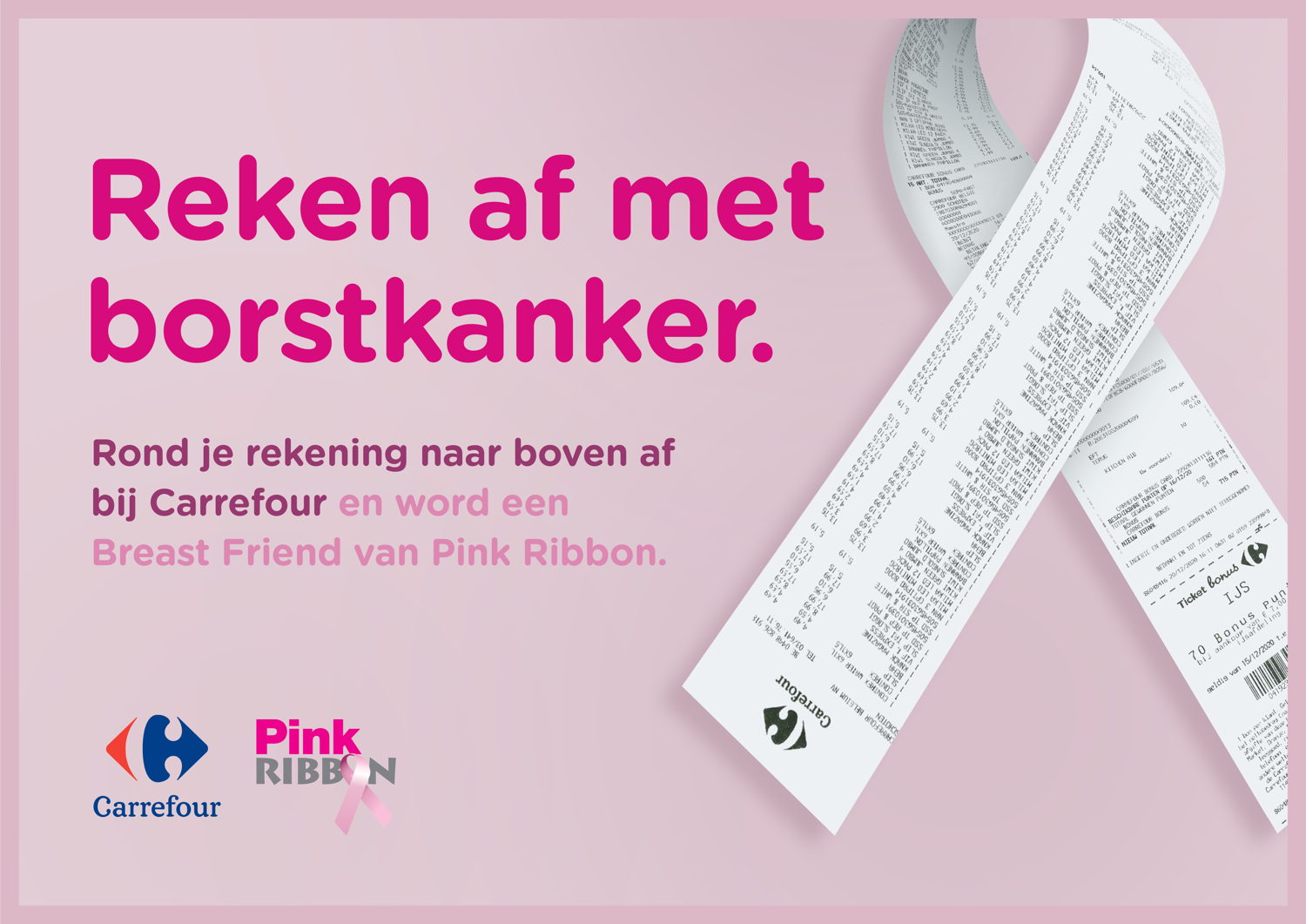 Voor het tweede jaar op rij lanceert Carrefour de campagne “De Solidaire Afronding”, dit jaar ten voordele van Pink Ribbon. Carrefour moedigt haar klanten aan om het totaalbedrag van hun aankopen naar boven af te ronden. Deze grootschalige actie maakt het mogelijk om met een paar kleine centjes bij elkaar een grote bijdrage te leveren aan een goed doel.
