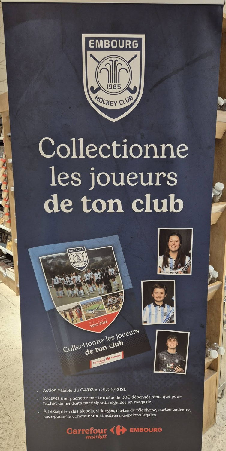 Ce partenariat réunit deux piliers fondamentaux : l'Embourg Hockey Club, une institution sportive comptant plus de 850 membres, et le Carrefour Market d’Embourg, acteur économique de la commune employant une trentaine de personnes. L'album propose de collectionner 700 vignettes uniques représentant toutes les équipes du club, masculines et féminines, des plus jeunes catégories jusqu'aux équipes premières évoluant en deuxième division Belge.