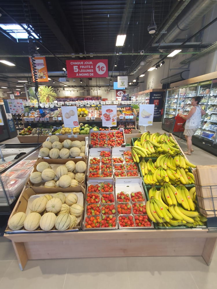 Dès l’entrée, les clients découvrent un vaste marché frais avec un bel assortiment de fruits et légumes colorés. Le comptoir réfrigéré propose olives, fromages, dips, tapas et bien plus encore pour l’apéro.
